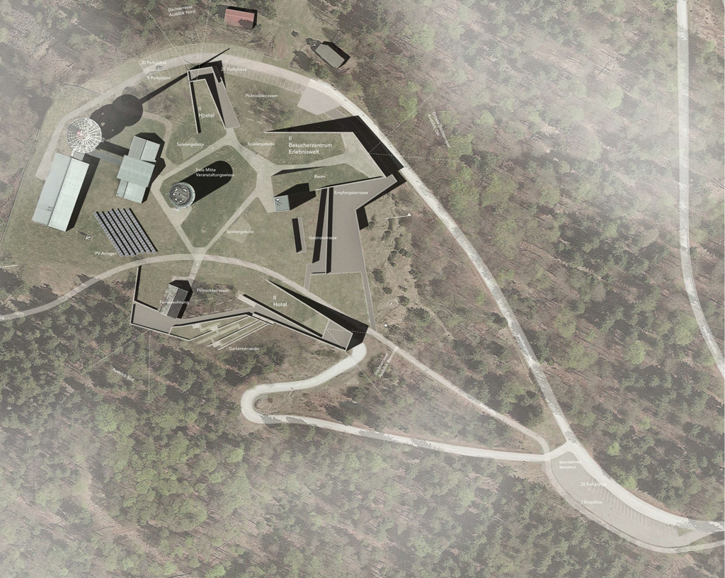 Diesem Leitmotiv folgend ergibt sich für das Freiraumkonzept ein oberstes Prinzip: Der freie Blick zu allen Seiten muss möglich sein. Die Bergkuppe bleibt bis auf die schon gebauten Gebäude frei von Blick verstellenden Neubauten. Die Dachflächen der neuen Gebäude werden zum Teil des Freiraums. Der Rennsteig läuft behutsam im großen Bogen als Tangente über die grüne Bergkuppe bevor er wieder in die bewaldete Umgebung eintaucht.