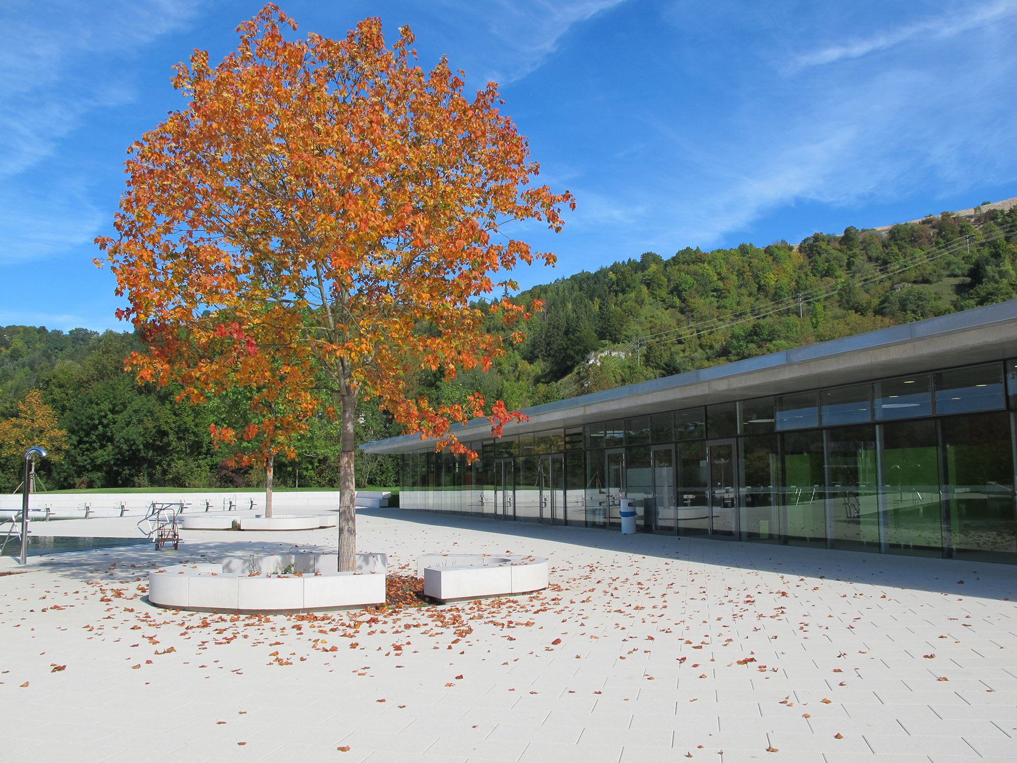 Die zurückhaltende Bebauung unterstützt die privilegierte naturräumliche Qualität des Freibads auf der Altmühlinsel durch wenige Eingriffe. Die formale Sprache der Maßnahmen imitiert nicht die Natur, sie zeigt vielmehr den ordnenden Eingriff in kultivierter Landschaftsgestalt