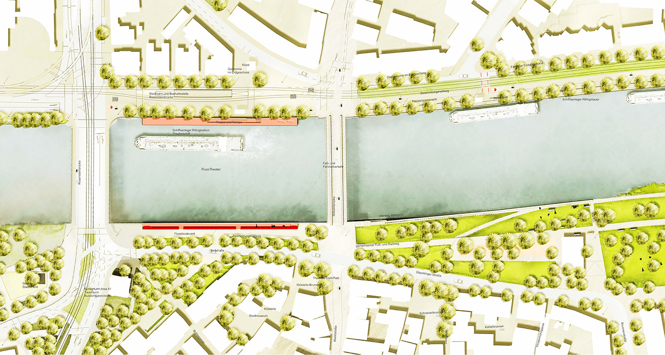 Der Entwurf begreift das Neckarknie als Zusammenspiel zweier unterschiedlicher Stadträume: